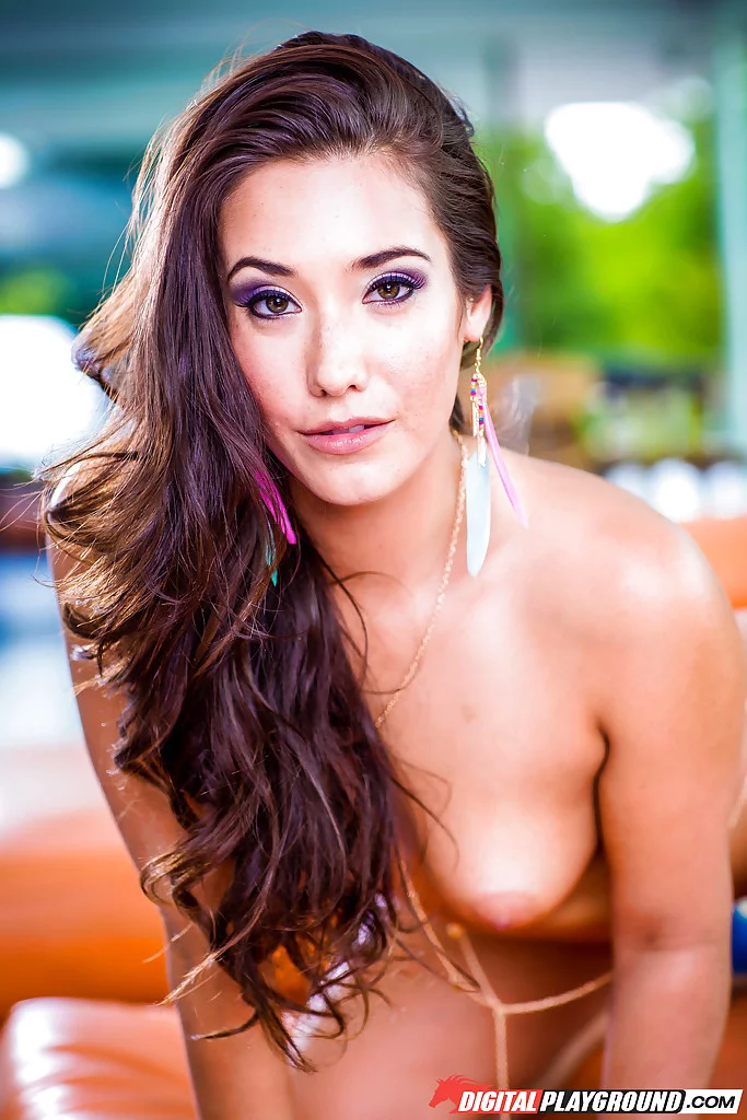 Брюнетка с пистолетом освобождает идеальные сиськи и сексуальную попку от нижнего белья